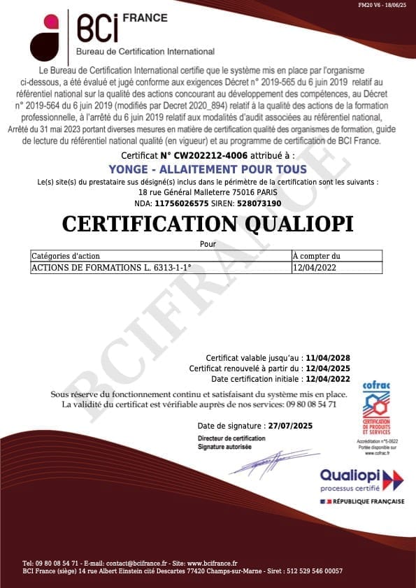 13 L-CERP (Lactation). N° enregistrement de formation323010K. Allaitement Pour tous a été reconnu par l'International Board of Lactation Consultant Examiners® (IBLCE®) en tant que prestataire CERP pour le programme de points de reconnaissance de l'éducation continue (CERP) répertorié. La détermination de l'éligibilité aux CERP ou du statut de prestataire CERP ne signifie pas que l'IBLCE® confirme ou évalue la qualité de la formation. INTERNATIONAL BOARD OF LACTATION CONSULTANT EXAMINERS®, IBLCE®, INTERNATIONAL BOARD CERTIFIED LACTATION CONSULTANT® et IBCLC® sont des marques déposées de l'International Board of Lactation Consultant Examiners".
